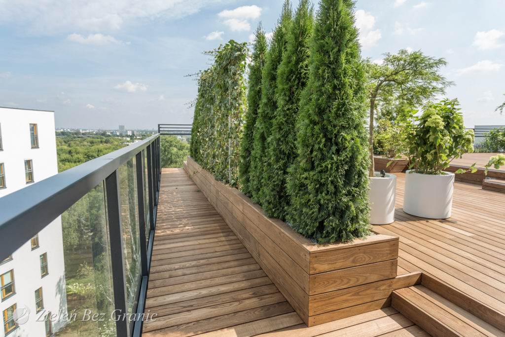 Zaprojektowane drzewka, krzewy i bluszczowe ścianki sprawiają, że taras jest osłonięty, a widok z okien nabiera barw. Dzięki odpowiednio dobranym gatunkom roślin taras wygląda ciekawie przez cały rok.