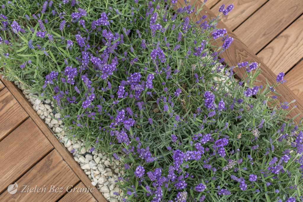 Nowoczesny, drewniany taras, został zaprojektowany na dwóch poziomach. Na części podwyższonego tarasu znajduje się strefa wypoczynkowa, częściowo zadaszona nowoczesną pergolą. Pergola jest osłonięta od wiatru przez bluszczową ściankę oraz drewniany panel. Poziomy tarasu są rozdzielone przez drewniane donice z roślinami. Na niższym poziomie zaplanowaliśmy część jadalnianą.