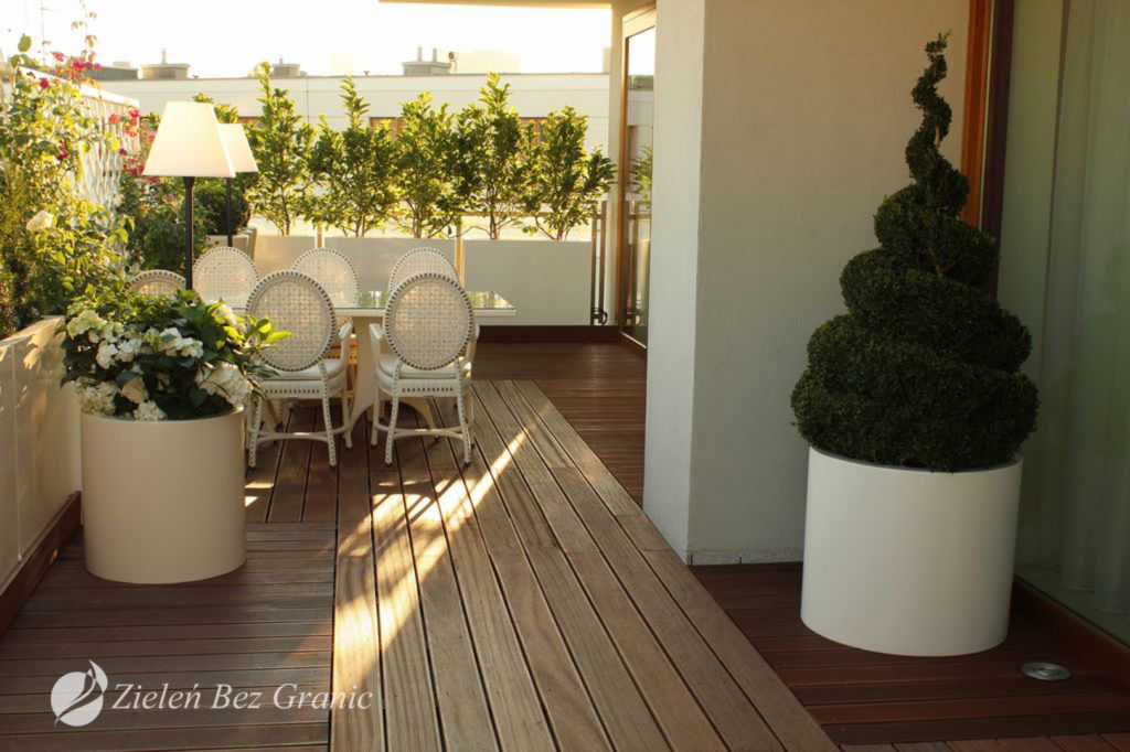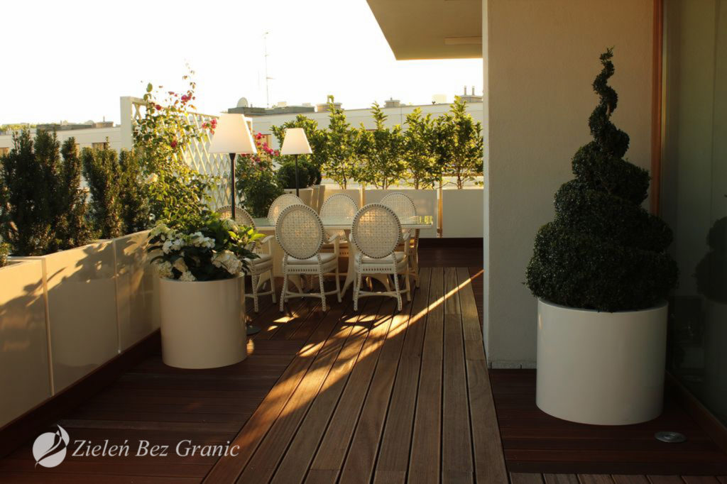 Zaprojektowaliśmy ten taras tak, aby stanowił przedłużenie salonu. Elegancji tej przestrzeni dodaje skontrastowanie brązowej podłogi z drewna egzotycznego z białymi meblami i donicami. Pod względem funkcjonalnym taras podzielono na dwie części, pierwszą – wypoczynkową – z kanapami i stolikiem kawowym. Drugą z krzesłami i stołem do wieczornych kolacji z rodziną i przyjaciółmi. Z tego względu zadbano również o wieczorny nastój na tarasie poprzez odpowiednie oświetlenie. Taras zaprojektowano tak, aby móc cieszyć się nim przez cały rok. W letnie dni stanowi azyl chroniący przed wielkomiejskim zgiełkiem, zimą zaś zapewnia piękny obraz za oknem.