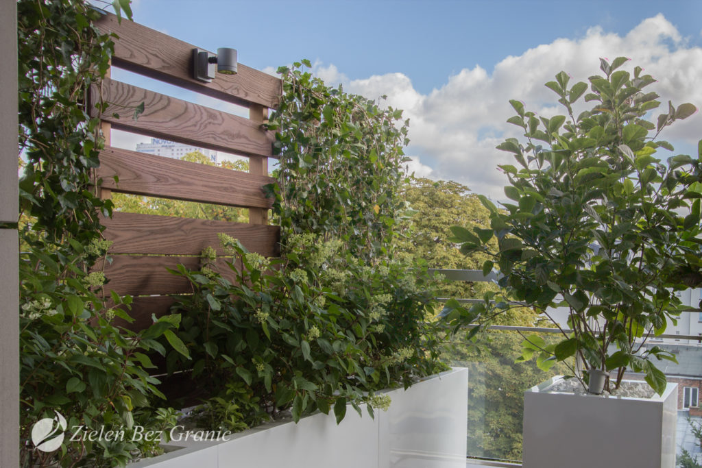 Projekt zakładał zaaranżowanie dwóch eleganckich i zarazem przytulnych tarasów w samym sercu miasta. Właścicielom mieszkania zależało by mieć swój zielony azyl, odizolowany od zgiełku ulic. Zastosowano tutaj połączenie kontrastujących ze sobą materiałów i kolorów – ciepłego, ciemnobrązowego drewna nawierzchni z chłodną bielą donic wykonanych z tworzywa sztucznego. Ciekawy efekt wniosły drewniane panele korespondujące z podłogą.
