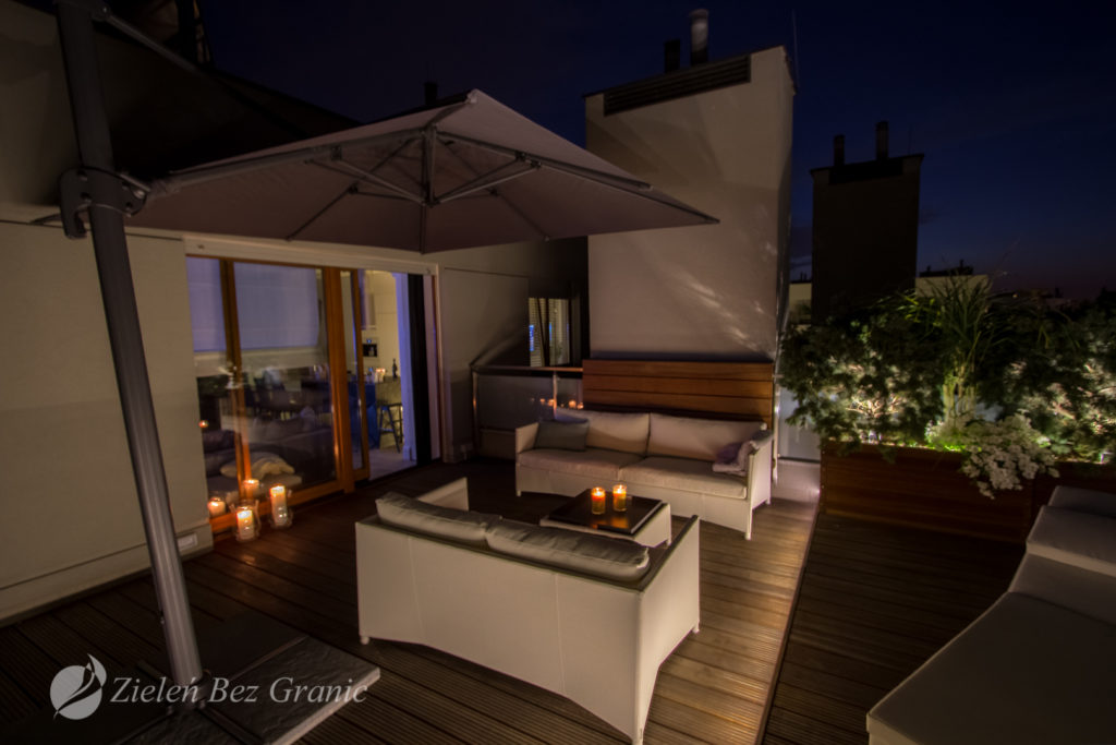 Głównym założeniem było stworzenie przyjaznego miejsca do wypoczynku na tarasie. Efekt osiągnięto poprzez wydzielenie strefy wyposażonej w eleganckie białe meble oraz parasol dający kojący cień w słoneczne letnie dni. Całość dopełnia kompozycja roślin w drewnianych donicach, która nadaje przestrzeni kameralny charakter.